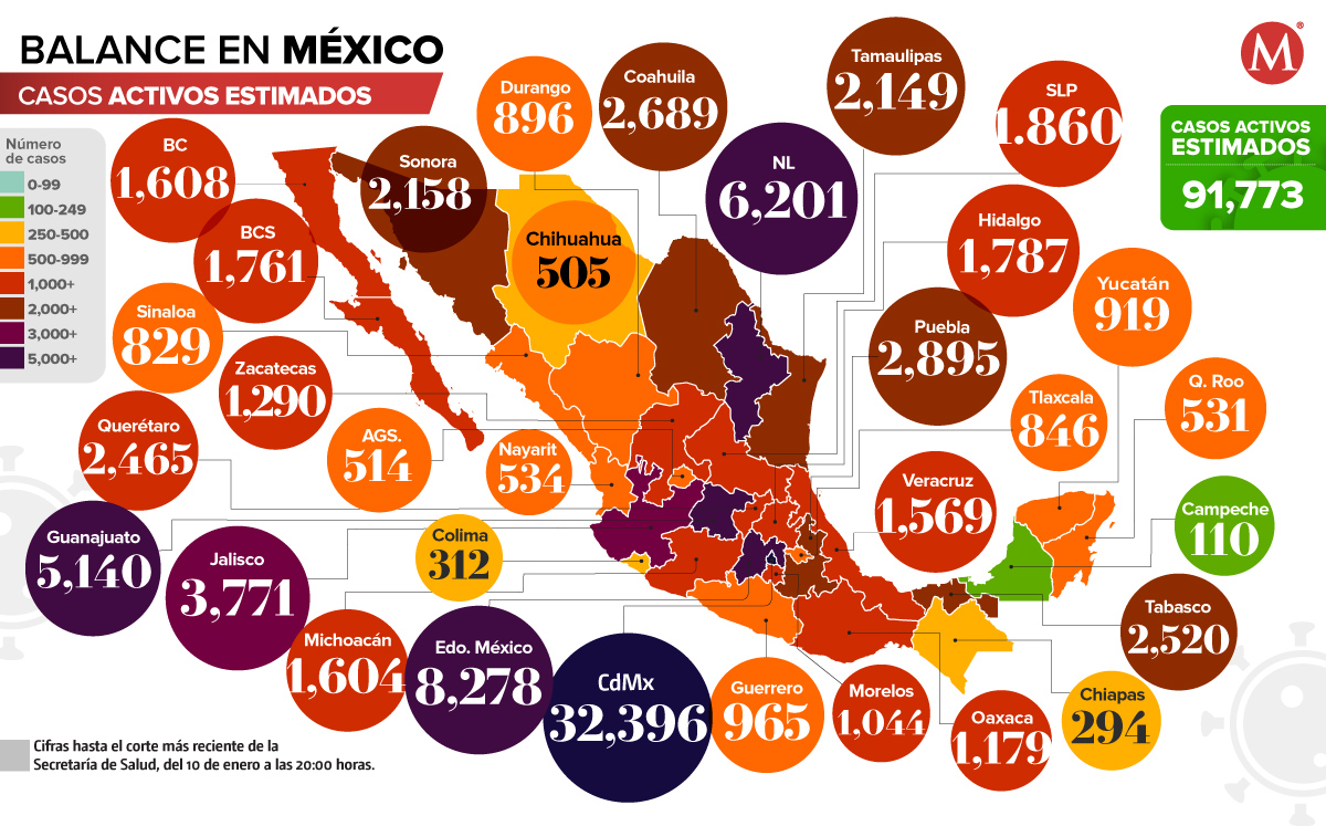 La Ciudad de México y el Estado de México son las entidades con mayor número de casos activos estados; mientras que Campeche es el estado con menor cantidad de pacientes con síntomas de la enfermad.