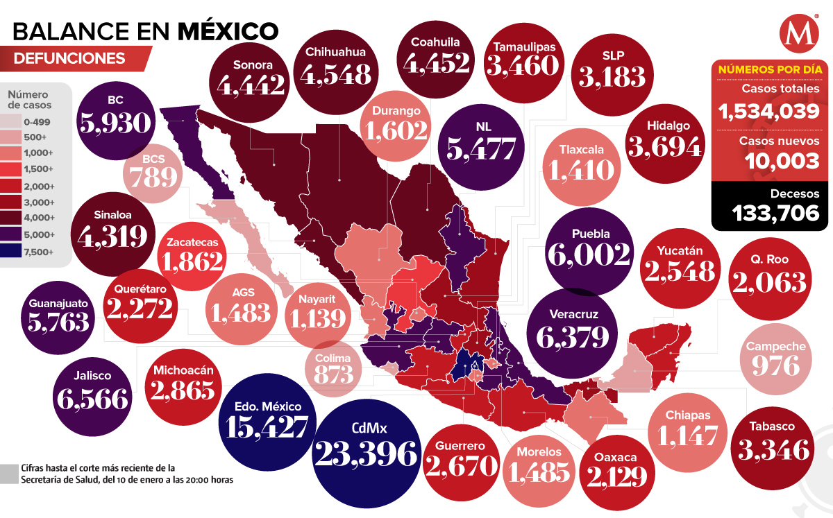 La Ciudad de México y el Estado de México son las entidades con mayor número de muertes por coronavirus; mientras que Baja California sur tiene la menor cifra.