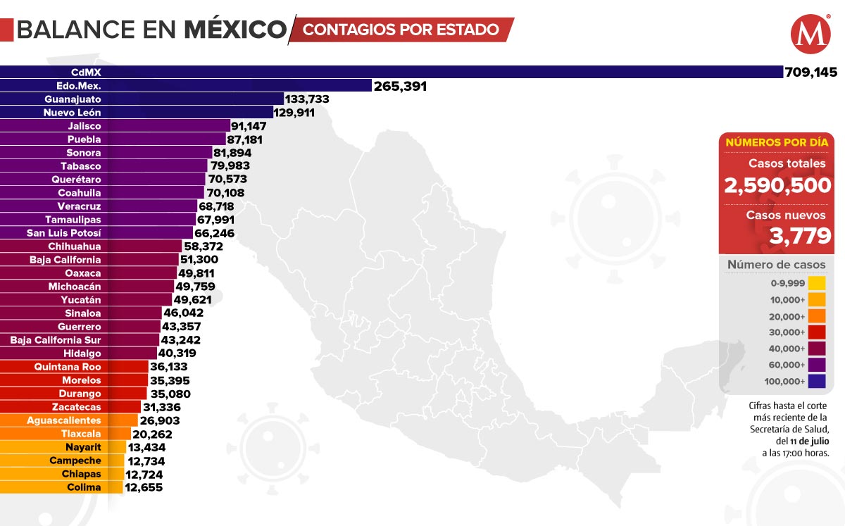 En tanto, la Ciudad de México tiene la mayor tasa de casos acumulados de coronavirus, con 7 mil 863 contagios confirmados por cada 100 mil habitantes.