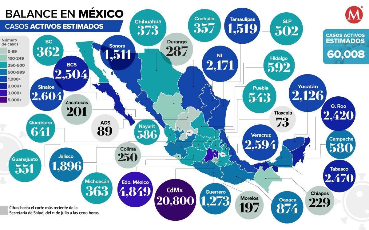 La Ciudad de México y el Estado de México son las entidades con la mayor cantidad de casos activos estimados de coronavirus; mientras que Tlaxcala y Aguascalientes tienen la menor cifra de contagios.
