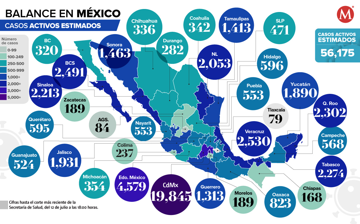 La Ciudad de México y el Estado de México son las entidades con la mayor cantidad de casos activos estimados de coronavirus; mientras que Tlaxcala tiene la menor cifra.