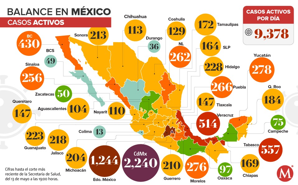 La Ciudad de México, el Estado de México, Veracruz y Tabasco son los únicos estados que tienen más de 500 casos; mientras que en total, son 10 entidades con más de 250 contagios activos.