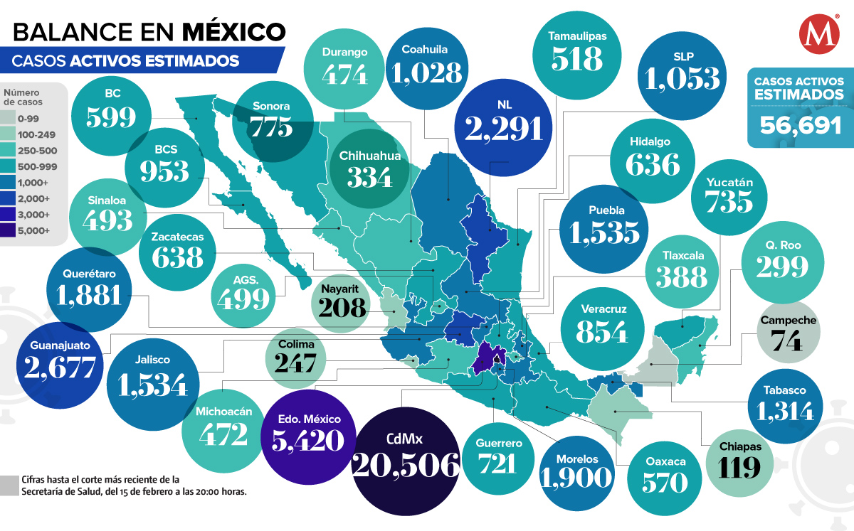 La Ciudad de México y el Estado de México son las entidades con mayor número de casos activos estimados de coronavirus; mientras que Campeche tiene la menor cifra.