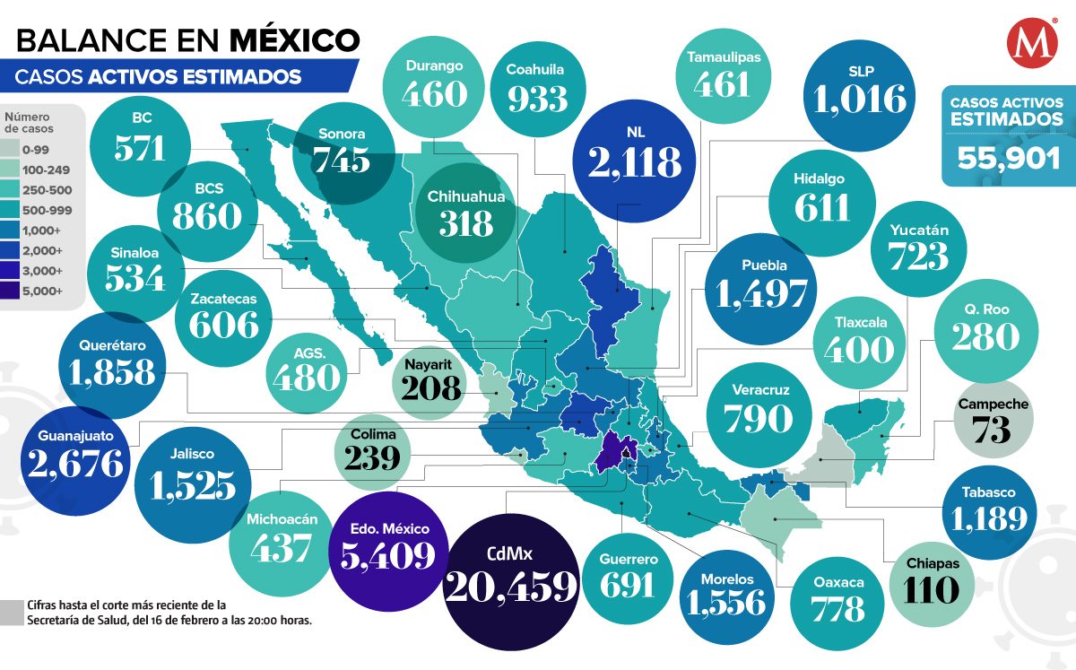 La Ciudad de México y el Estado de México son las entidades con mayor número de casos estimados activos de coronavirus; mientras que Campeche tiene la menor cifra.