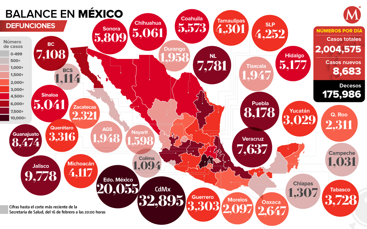 La Ciudad de México y el Estado de México son las entidades del país con mayor número de muertes por coronavirus; mientras que Baja California Sur tiene la menor cifra.