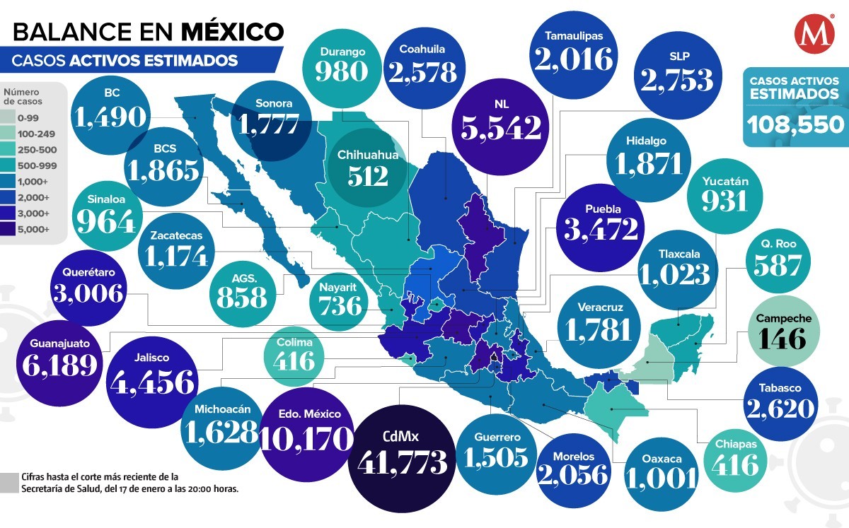 La Ciudad de México y el Estado de México son las entidades con mayor número de casos activos estimados de coronavirus; mientras que Campeche tiene la menor cifra.