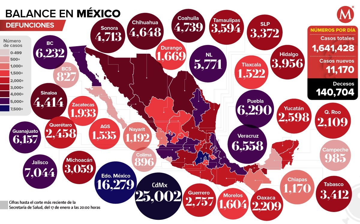 La Ciudad de México y el Estado de México son las entidades con mayor número de muertes por coronavirus: mientras que Baja California Sur tiene la menor cifra.