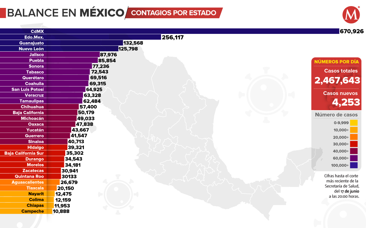 En tanto, la Ciudad de México es la entidad con la mayor tasa de mortalidad, con 381.47 defunciones por coronavirus por cada 100 mil habitantes.