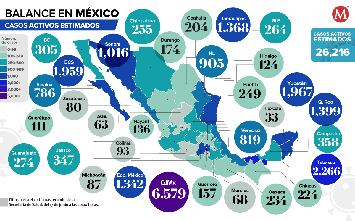 La Ciudad de México y Tabasco son las entidades con la mayor cantidad de casos activos estimados de coronavirus; mientras que Tlaxcala tiene la menor cifra de contagios.