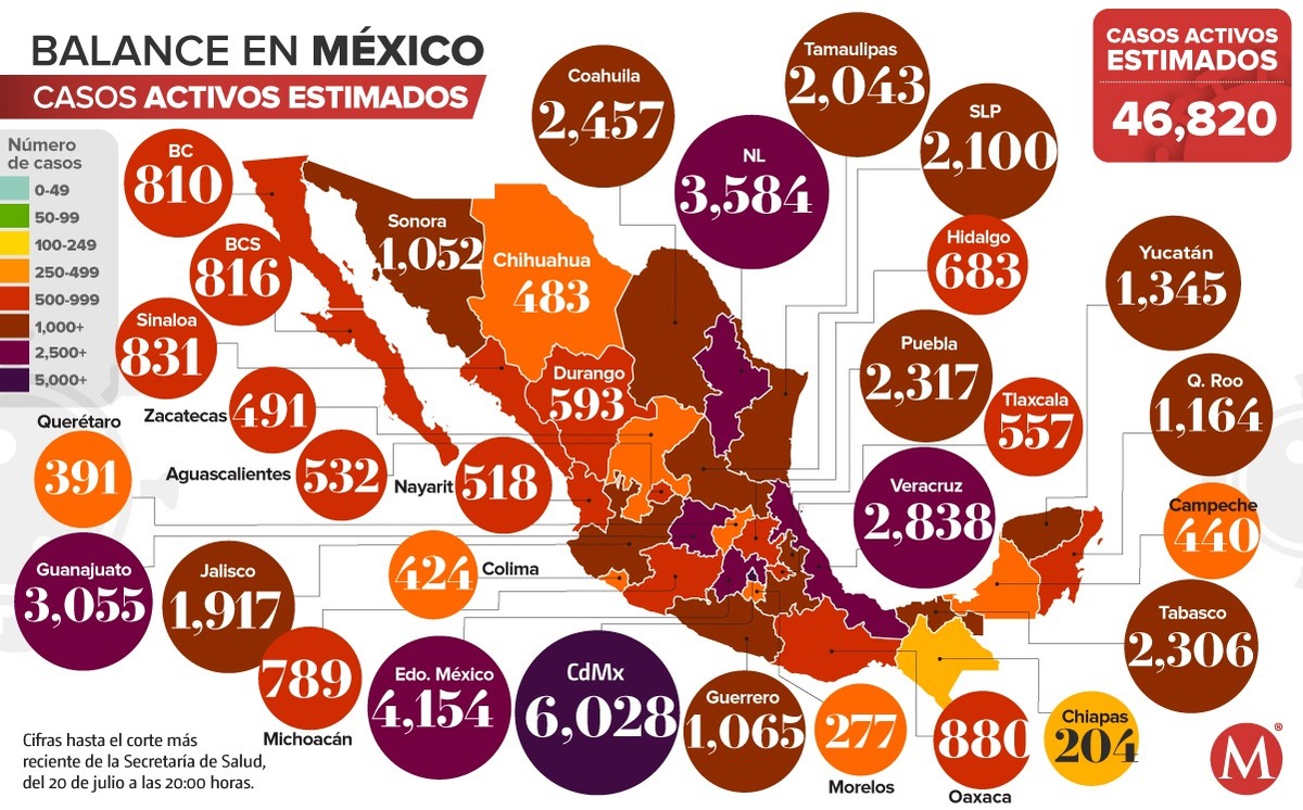 La Ciudad de México, el Estado de México, Guanajuato, Nuevo León y Veracruz son las entidades con más casos activos de coronavirus; mientras que en total, son 14 estados los que reportan más de mil pacientes con síntomas de la enfermedad.
