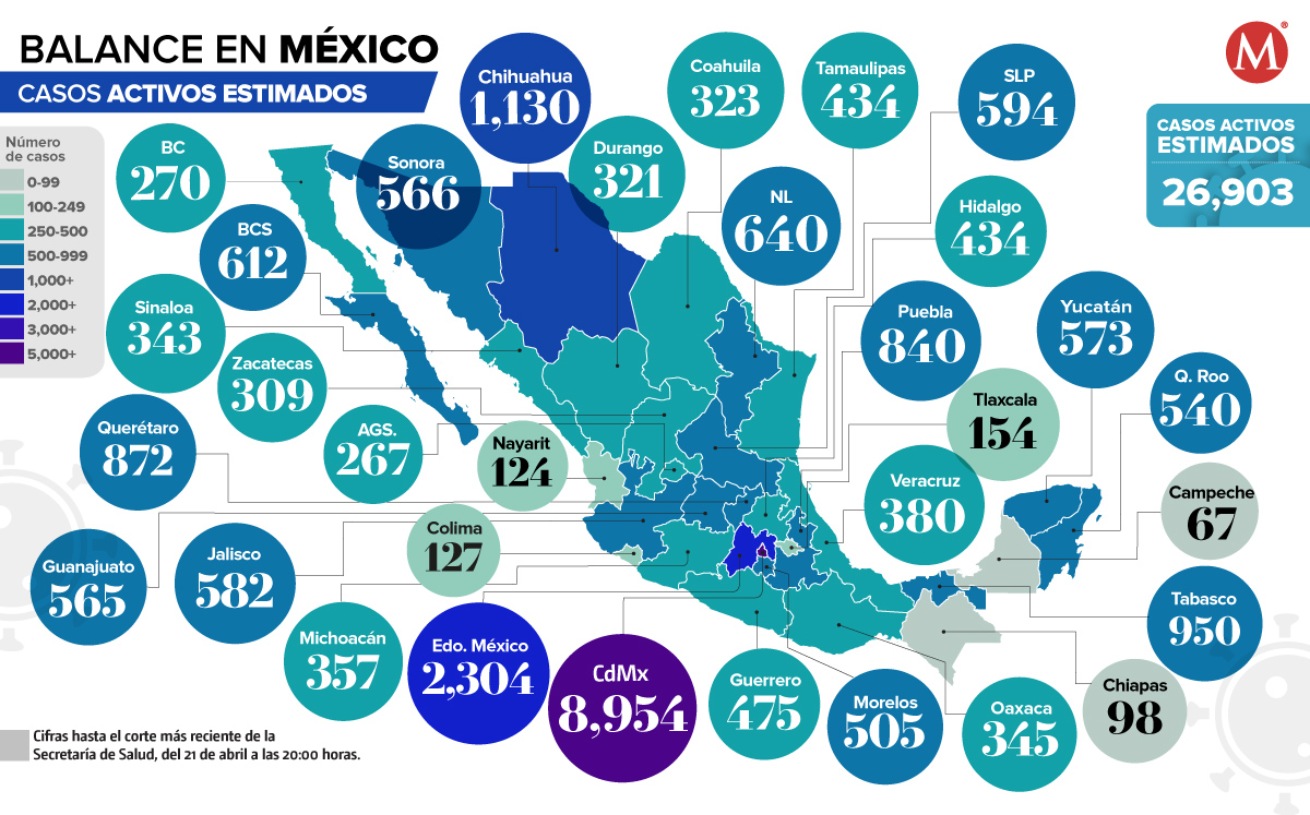 La Ciudad de México y el Estado de México son las entidades con la mayor cantidad de casos activos y estimados de coronavirus; mientras que Campeche tiene la menor cifra.