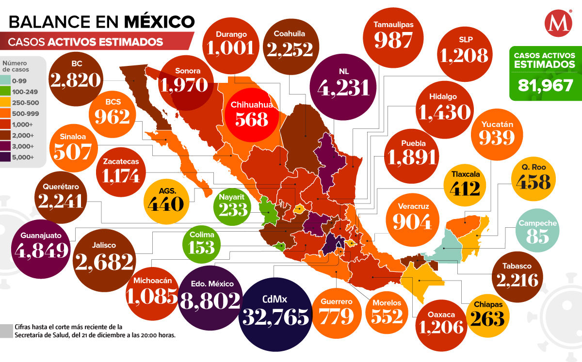 La Ciudad de México y el Estado de México son las entidades con mayor número de casos activos estimados de coronavirus; mientras que Campeche tiene la menor cifra.
