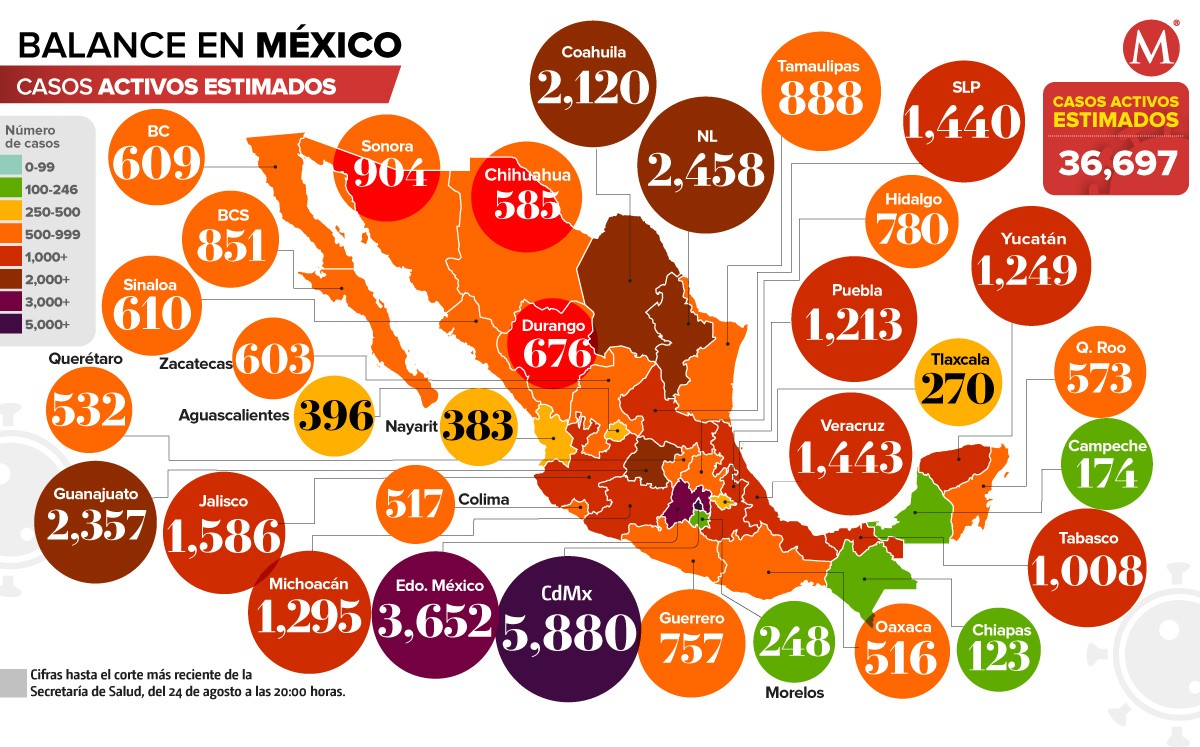 La Ciudad de México y el Estado de México son las entidades con mayor número de casos activos estimados de coronavirus; mientras que Chiapas y Campeche son las entidades con menos contagios.