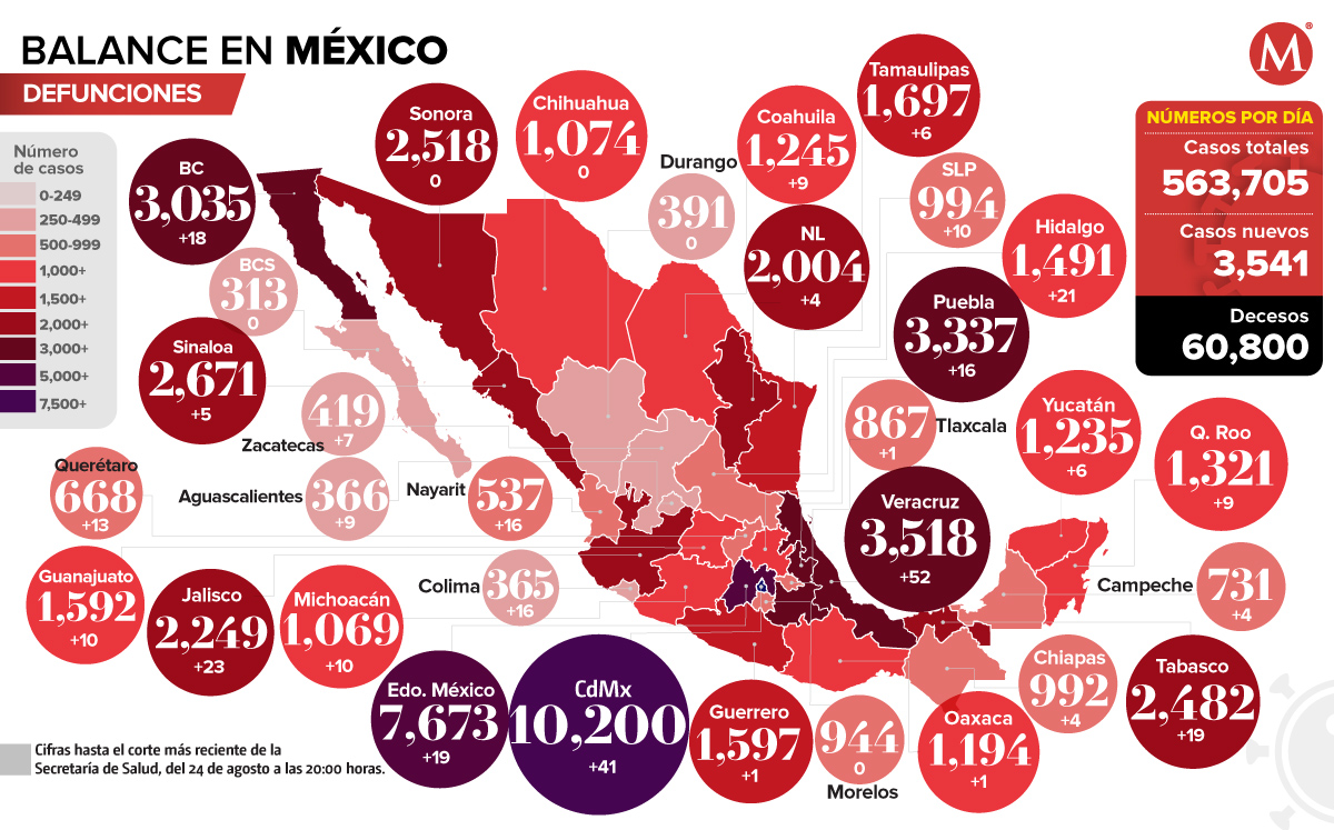 La Ciudad de México, el Estado de México, Veracruz, Puebla y Baja California son lo sestados con mayor número de defunciones por coronavirus hasta el momento.