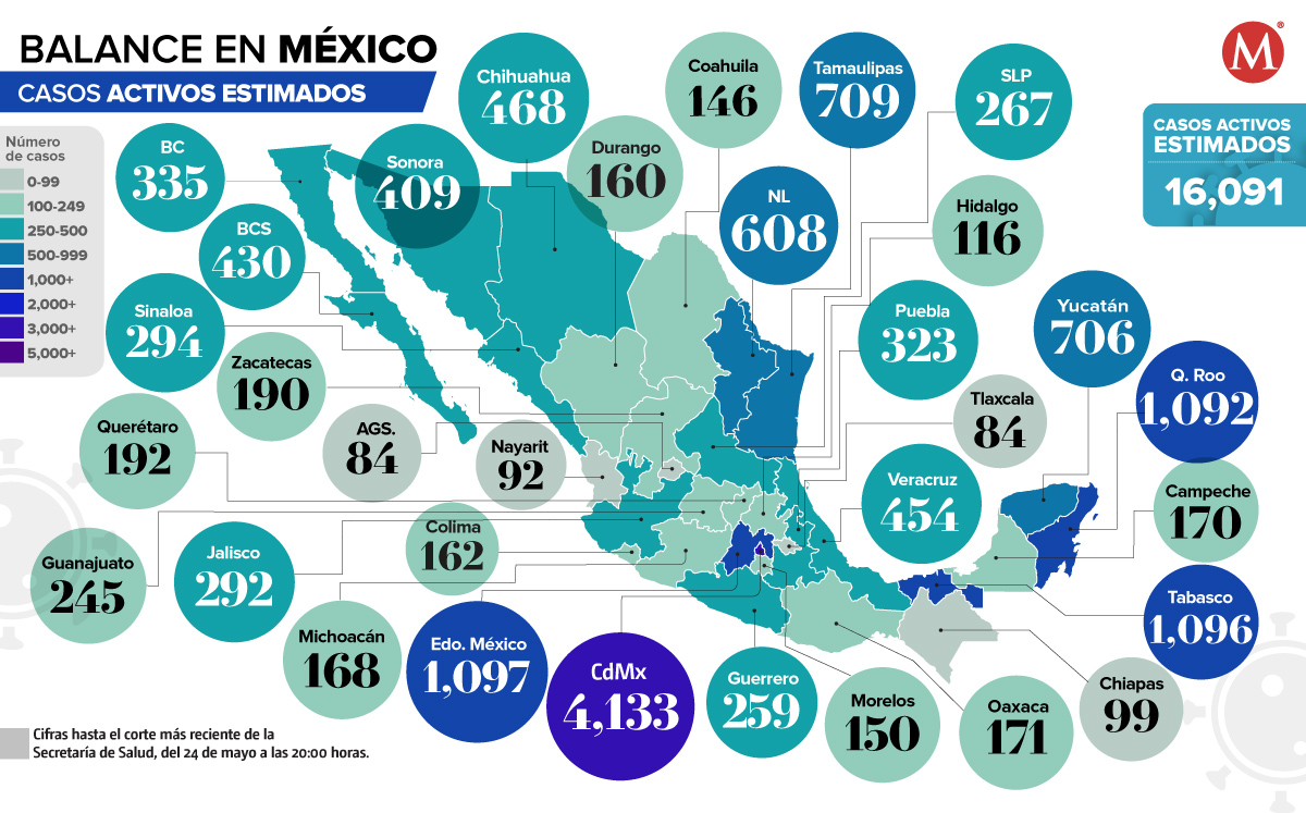 La Ciudad de México y el Estado de México son las entidades con la mayor cantidad de casos activos estimados de coronavirus; mientras que Tlaxcala tiene la menor cifra.