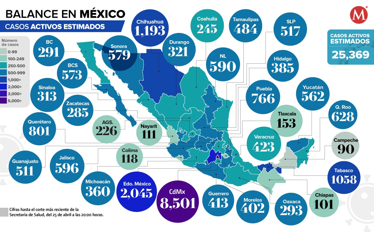 La Ciudad de México y el Estado de México son las entidades con la mayo cantidad de casos activos estimados de coronavirus; mientras que Campeche tiene la menor cifra de contagios.