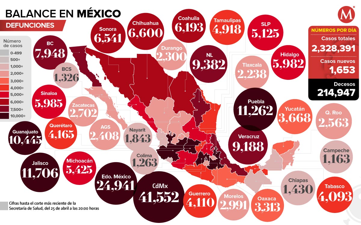 La Ciudad de México y el Estado de México son las entidades con la mayor cantidad de muertes por coronavirus; mientras que Campeche tiene la menor cifra.