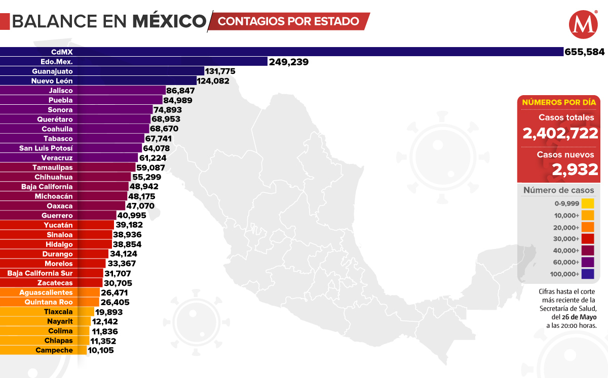 La Ciudad de México y el Estado de México son las entidades con la mayor cantidad de casos estimados de coronavirus; mientras que Tlaxcala tiene la menor cifra.