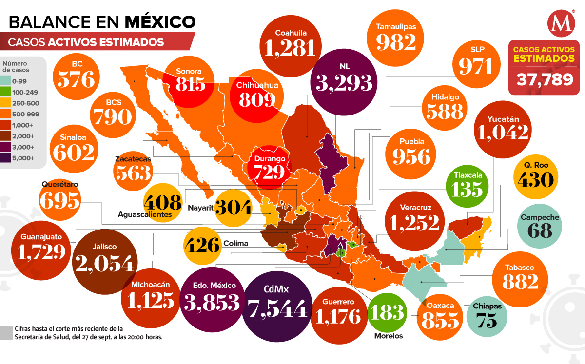 La Ciudad de México y el Estado de México son los estados con más casos activos estimados de coronavirus; mientras que Campeche tiene la menor cantidad.