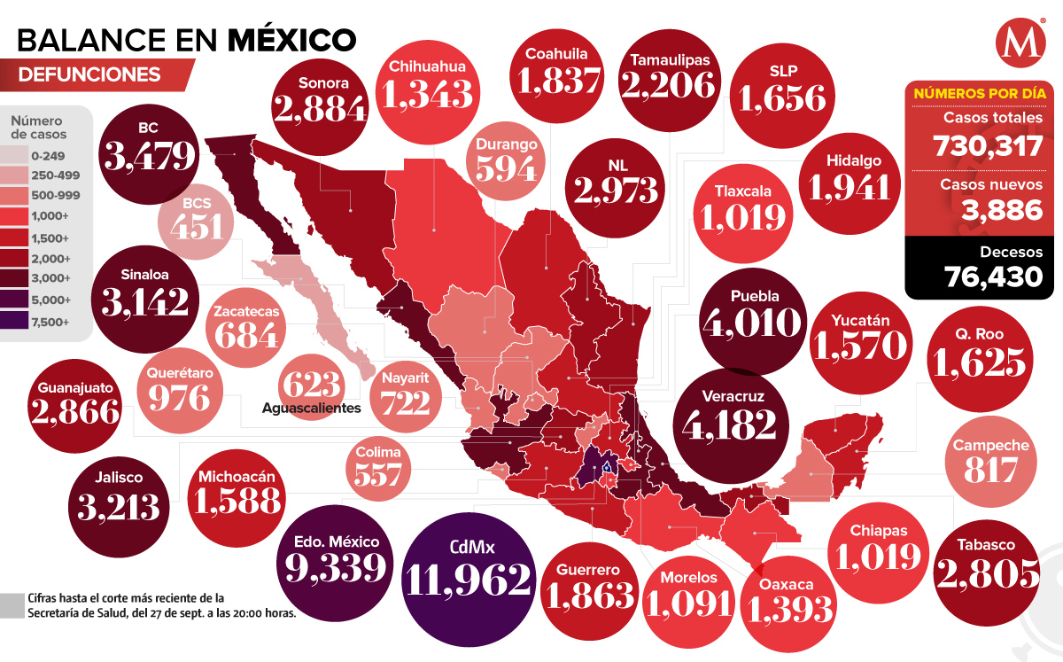 La Ciudad de México y el Estado de México son las entidades que más muertes por coronavirus han registrado; mientras que Baja California Sur tiene la menor cantidad.