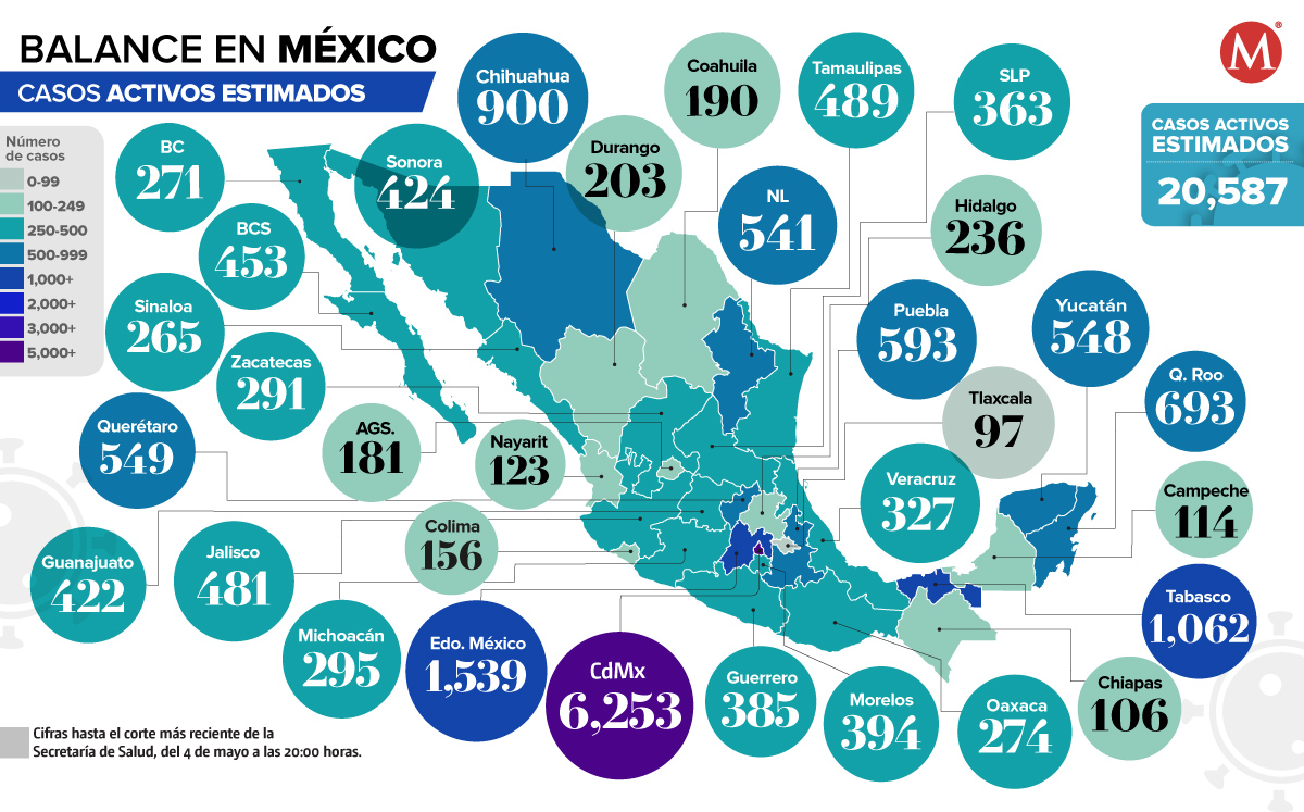 La Ciudad de México y el Estado de México son las entidades con la mayor cantidad de casos activos estimados de coronavirus; mientras que Tlaxcala tiene la menor cantidad de contagios.