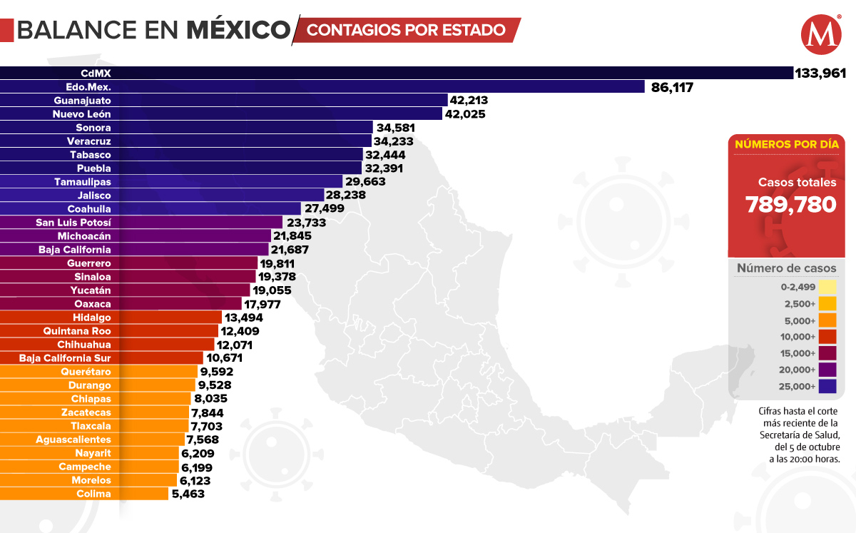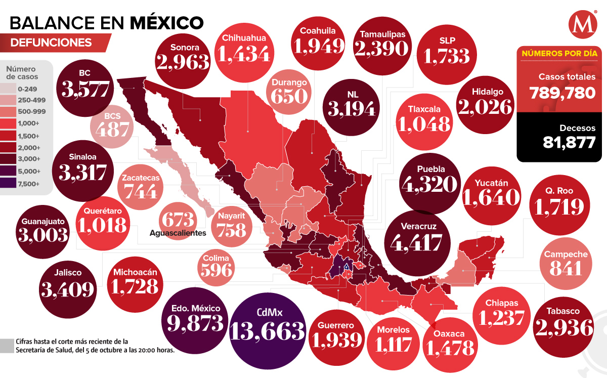 La Ciudad de México y el Estado de México son las entidades con mayor número de muertes por covid-19; mientras que Baja California Sur tiene la menor cantidad.