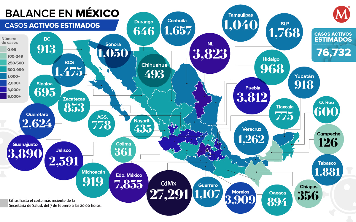 La Ciudad de México y el Estado de México son las entidades que más casos activos estimados tienen; mientras que Campeche tiene la menor cifra.