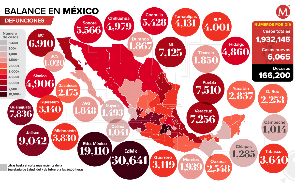 La Ciudad de México y el Estado de México son las entidades con más muertes por coronavirus; mientras que Baja California Sur tiene la menor cifra.