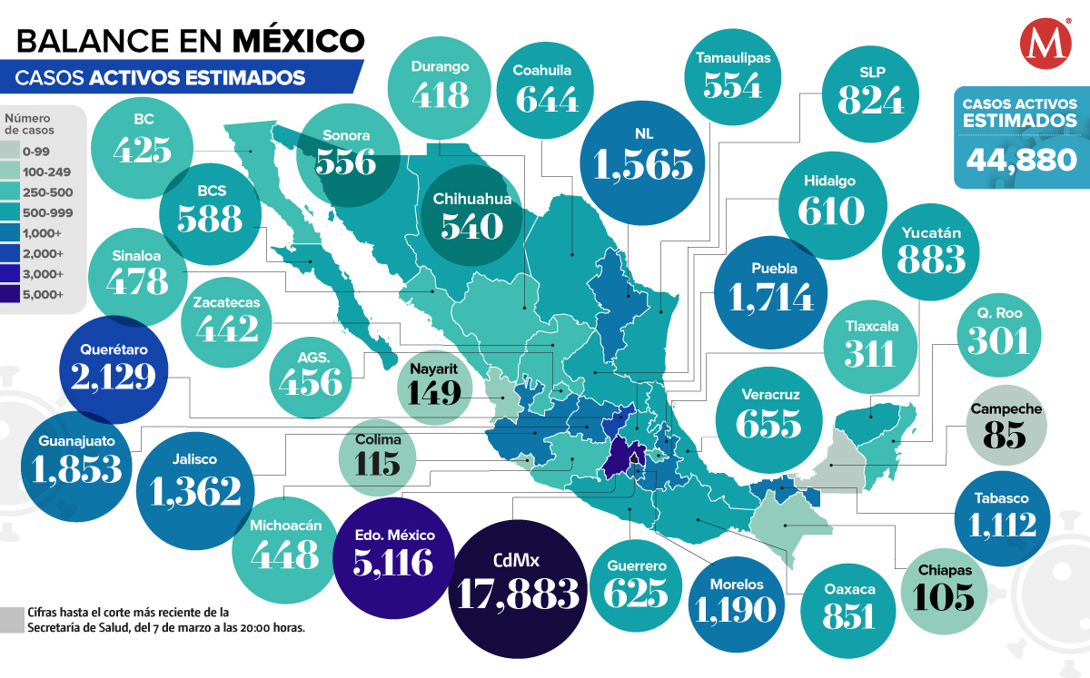 La Ciudad de México y el Estado de México son las entidades con mayor número de casos activos estimados de coronavirus en el país; mientras que Campeche tiene la menor cifra.