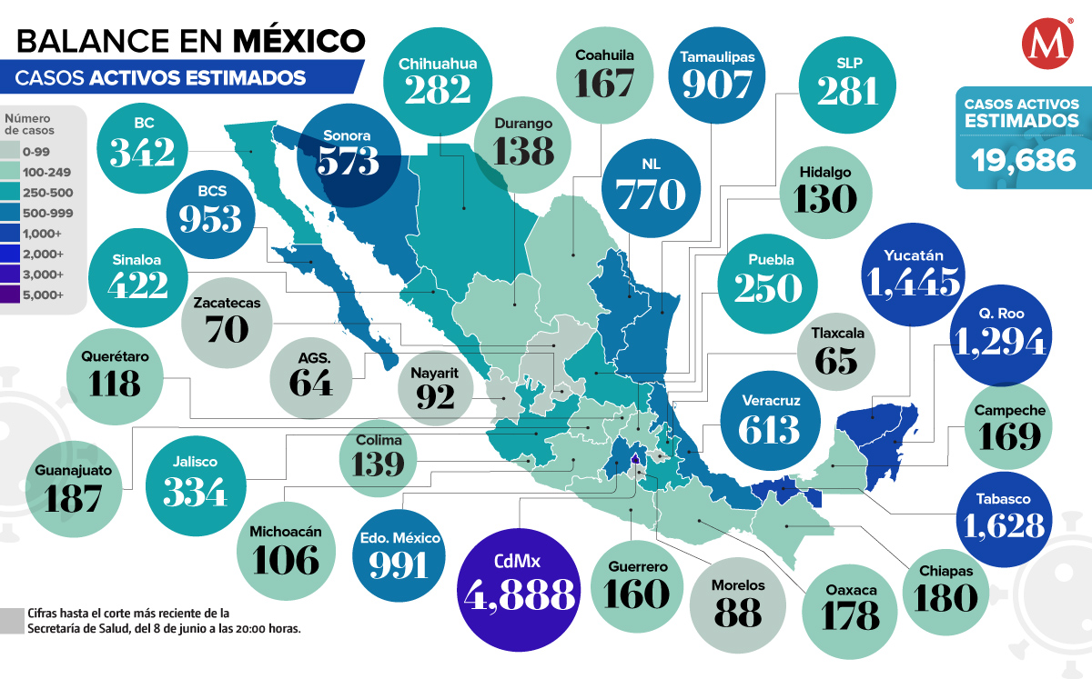 La Ciudad de México y el Estado de México son las entidades con la mayor cantidad de casos activos estimados; mientras que Tlaxcala tiene la menor cifra.