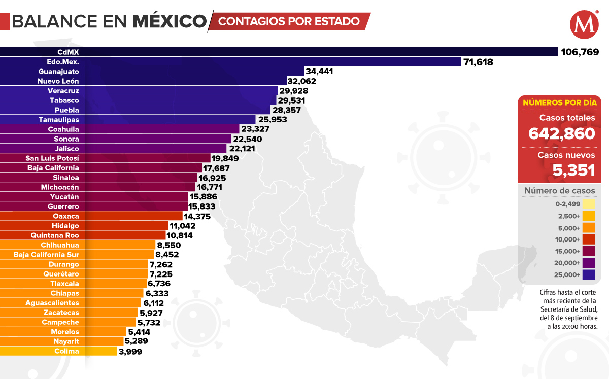 Baja California Sur es el estado con mayor incidencia de casos activos de coronavirus en México, con 112 contagios por cada 100 mil habitantes; mientras que la Ciudad de México es la entidad con mayor tasa acumulada, con mil 183 pacientes por cada 100 mil habitantes.