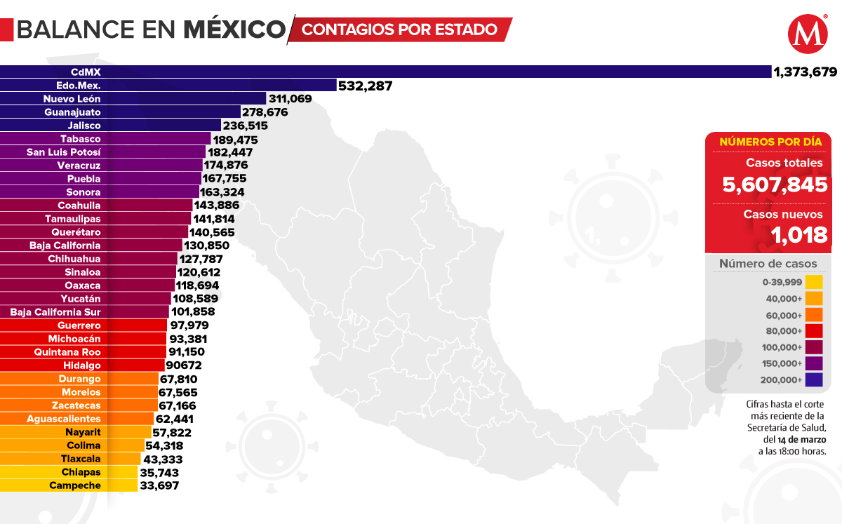 En Ciudad de México hay un total de un millón 373 mil 679 casos de covid-19, en el Estado de México se reportan 532 mil 287, Nuevo León confirma 311 mil 69, Guanajuato tiene 278 mil 676 y en Jalisco hay 236 mil 515.