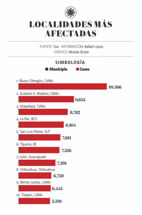 Los reportes diarios de la Secretaría de Salud revelan que en esas demarcaciones se han reportado 228 mil 719 casos positivos desde el 3 de diciembre pasado, mientras que en el resto de los municipios del país se han registrado 81 mil 793 infecciones para dar un total nacional de 310 mil 512 personas contagiadas.