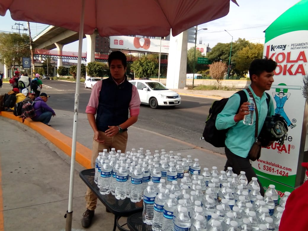Durante su caminata, los migrantes recibieron muestras de apoyo; tal es el caso de la empresa Kia, que repartió algunas botellas de agua a los centroamericanos.