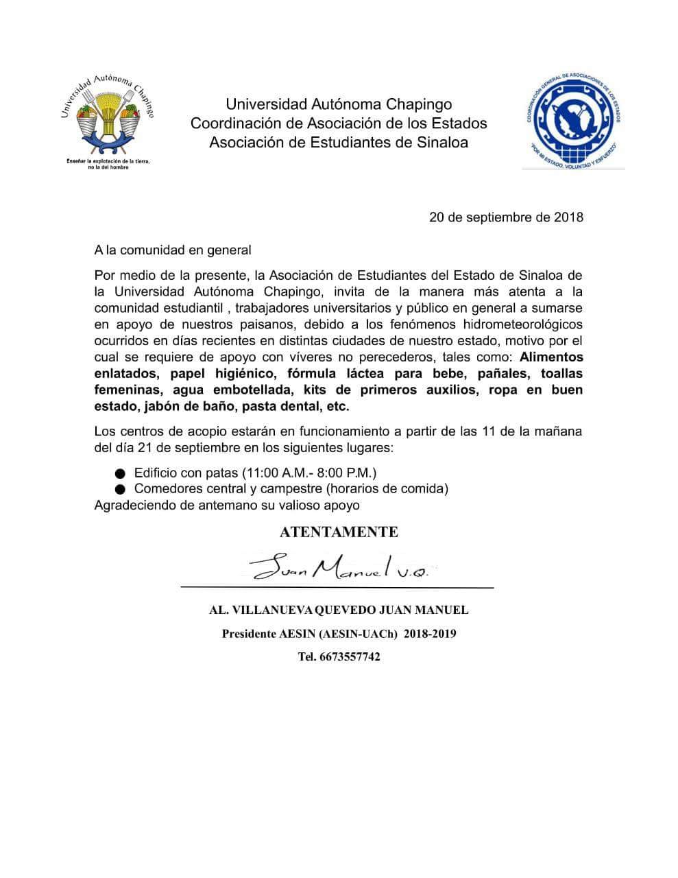 El gobierno de Sinaloa abrió un centro de acopio en Sta. Rosalía 116, colonia Insurgentes San Borja, delegación Benito Juárez. Aquí se recibirá el apoyo las 24 horas del día.