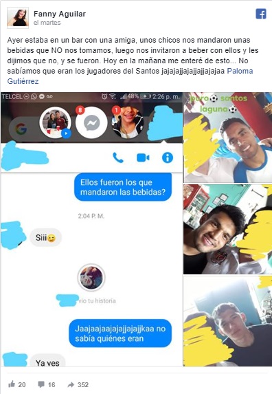 A través de Facebook, la joven explicó que primero recibieron bebidas pagadas por los santistas, sin embargo se negaron a aceptarlas, posteriormente recibieron la invitación para tomar en compañía de ellos.