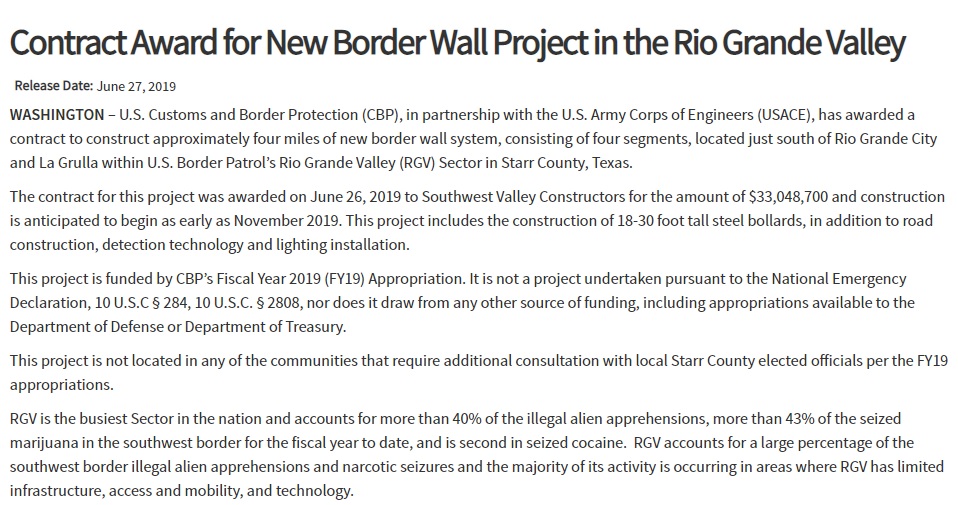 Este proyecto está financiado por la apropiación del año fiscal 2019 de CBP, por lo que no es un proyecto realizado de conformidad con la Declaración Nacional de Emergencia, decretada por el presidente Donald Trump.