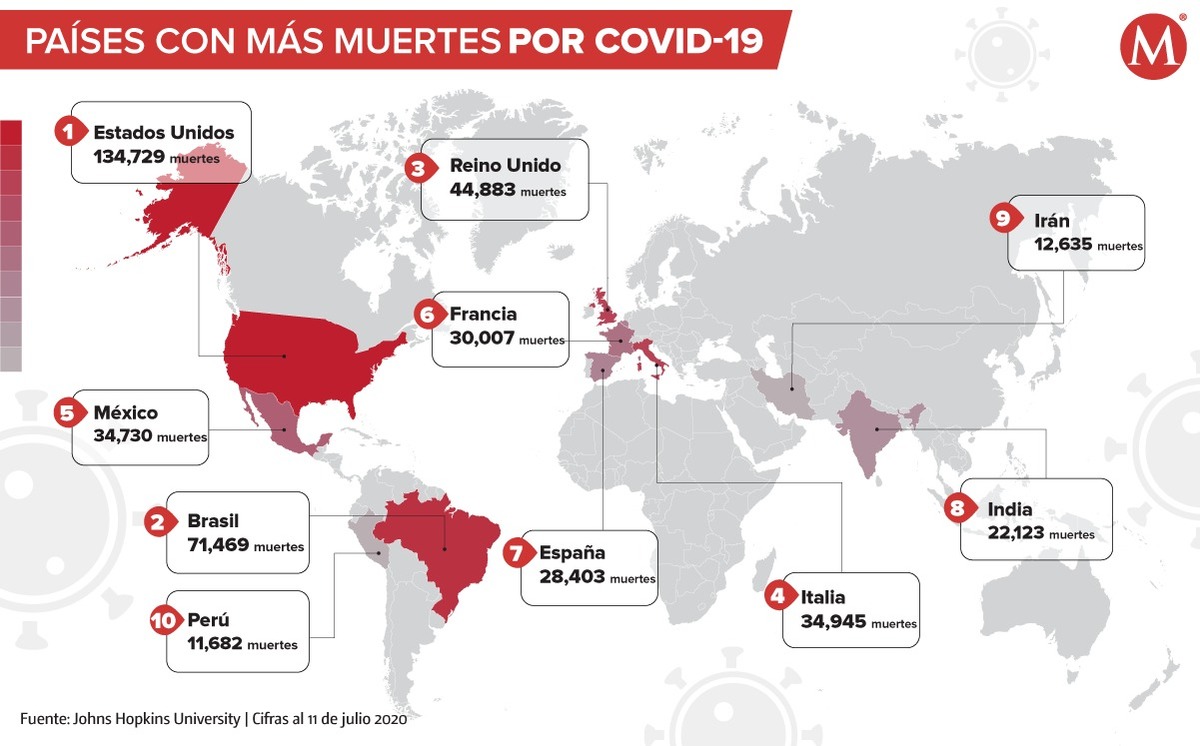 Durante la segunda semana de julio, aumentaron cerca de 35 mil muertos por el virus y se confirmaron más de 1.3 millones de nuevos casos. India se consolidó como el tercer país con más casos, mientras que México está cerca de superar en decesos a Italia.