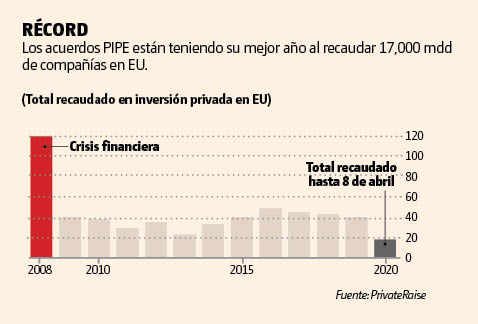 Grupos que cotizan en bolsa recauda ron 17,000 millones de dólares (mdd) en lo que va del año en acuerdos conocidos como PIPE •Inversiones Privadas en Capital Público•, en comparación con 9,000 mdd en el mismo periodo del año pasado, según cifras del proveedor de datos PrivateRaise hasta el 8 de abril.