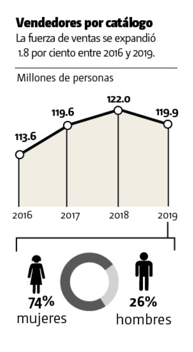 En su reporte anual de ventas 2019, la WFDSA indicó que del total de sus 119.9 millones de representantes, 7 por ciento estaba entre los 18 y 24 años; 19 por ciento, entre 25 y 34; 26 por ciento, entre 35 y 44; 25 por ciento, entre 45 y 54; y 23 por ciento tiene más de 55 años.