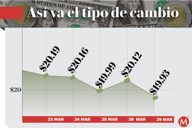 Banco Base publicó en su reporte que el peso inicia la sesión con una apreciación de 0.96 por ciento, o 19.3 centavos, cotizando alrededor de 19.93 pesos por dólar.