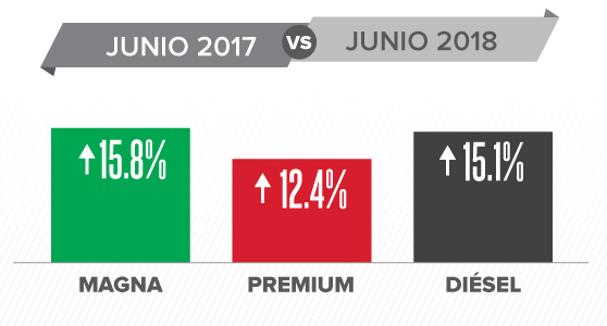 La gasolina tipo Magna se vendió en promedio en 18.06 pesos por litro en junio, un aumento de 15.8 por ciento o 2.47 pesos respecto a un año antes; la Premium en 19.57 pesos, con lo que subió 12.4 por ciento o 2.17 pesos; mientras que el diésel se ofreció en 19.12 pesos, 15.1 por ciento o 2.52 pesos.