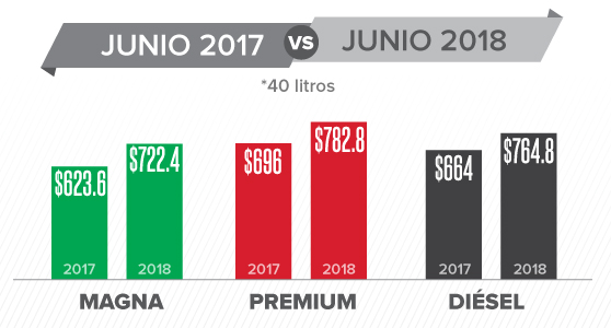 Esto significa que para comprar 40 litros de Magna en junio del año pasado se necesitaban 623.6 pesos, mientras que en el mismo mes pero de 2018 el costo se elevó a 722.4 pesos; para la Premium eran suficientes 696 pesos y este año se necesitaron 782.8; en el caso del diésel la inversión pasó de 664 pesos 764.8.
