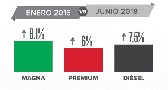 Respecto a enero de este año, en el sexto mes la Magna subió 8.1 por ciento o 1.36 pesos, la Premium aumentó 6 por ciento 1.12 pesos, mientras que el diésel 7.5 por ciento o 1.35 pesos.