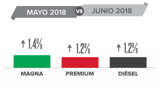 En comparación con los costos registrados en mayo de este año, en junio todas las gasolinas registraron alzas: la Magna 1.4 por ciento o 0.26 pesos, la Premium y el diésel subieron 1.2 por ciento o 0.24 pesos.