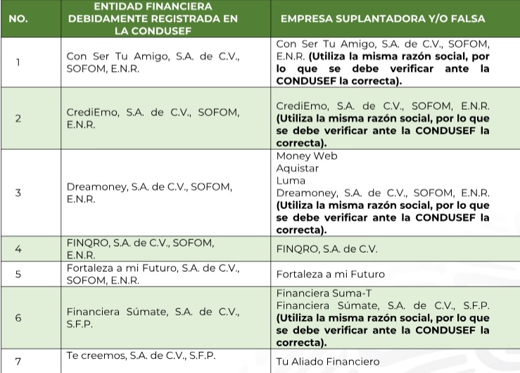 La Comisión Nacional para la Protección y Defensa de los Usuarios de Servicios Financieros (Condusef) informó que existen empresas se ostentan como entidades financieras, cuando en realidad están usurpando el nombre de otras que sí cuentan con registros oficiales.