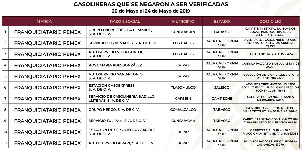 Detalló que derivado de las verificaciones, se inmobilizaron 14 mangueras y/o bombas. Además, explicó que las estaciones de servicio que se negaron a ser verificadas son todas de franquiciatarios de Pemex.