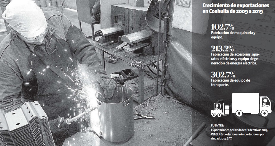Respecto a los estados de Coahuila y Durango, la ZML genera una parte importante de las exportaciones de estos productos, exceptuando por las partes de tractores y vehículos especiales, dado que de la región se origina el 86% del oro exportado en estas dos entidades, el 80% de la plata, el 90% del zinc y el 100% de los motores de émbolo de encendido por compresión.