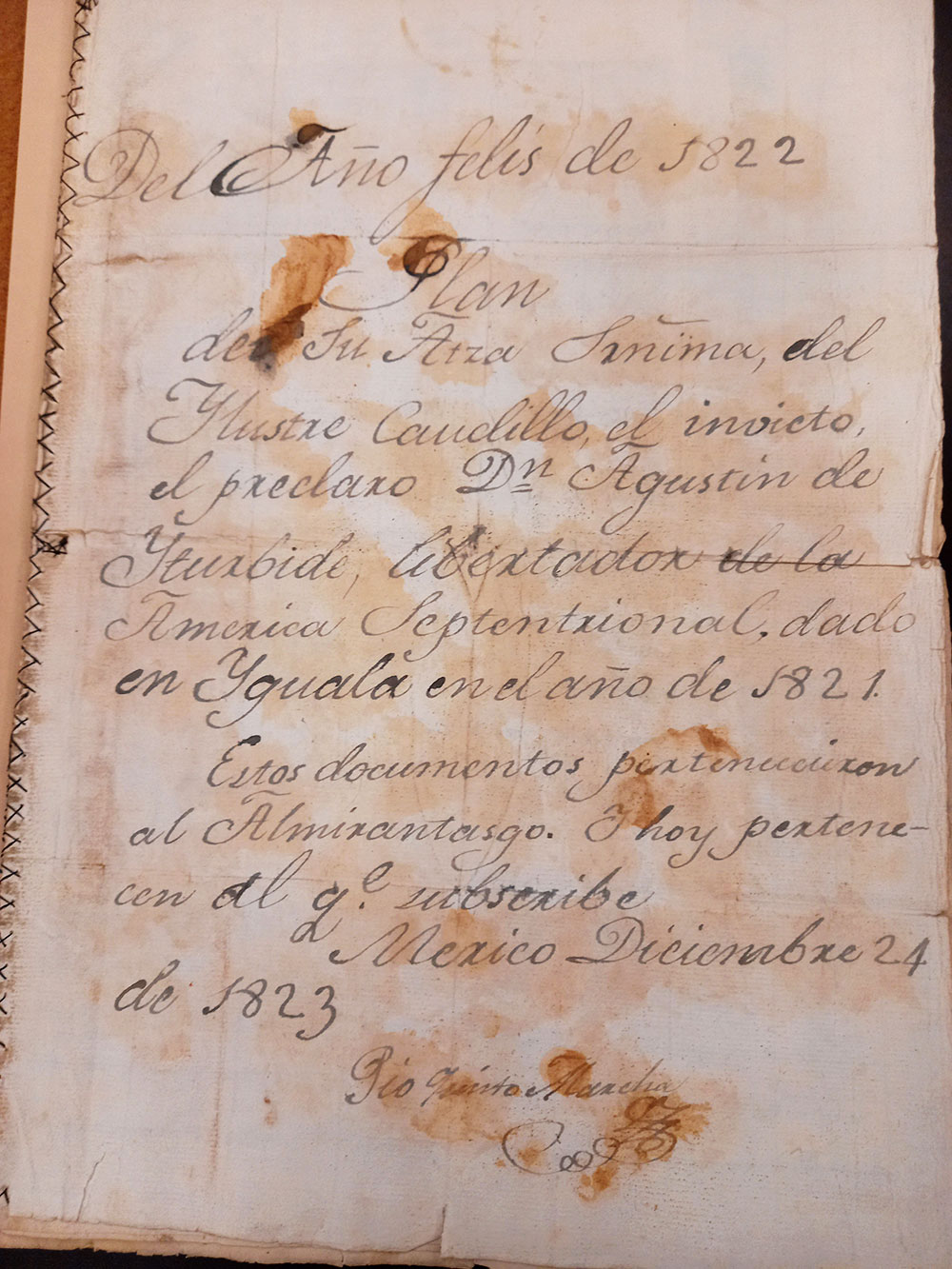 Al revisarlo, observamos que el Plan de Iguala y otras cartas dirigidas por Iturbide al virrey Félix María Calleja, están cosidas en un solo legajo. Pertenecieron nada menos que a Pío Quinto Marcha, el mismo militar que una noche lo proclamó emperador de México frente a su residencia, el Antiguo Palacio de Iturbide, en la calle de Madero, hoy sede del actual Palacio de Cultura Citibanamex.