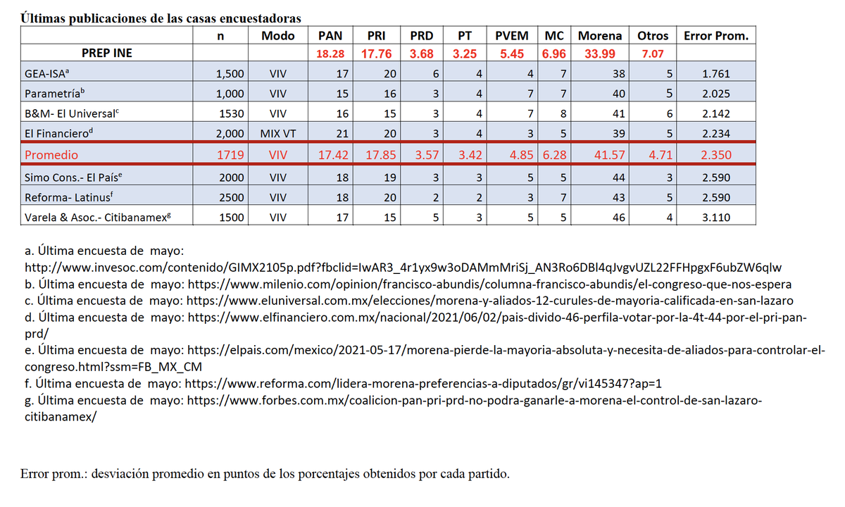 El saldo de las mediciones preelectorales de este proceso es mixto. La elección más visible fue la del Congreso. Si sólo consideramos esta podríamos decir que el saldo en general fue positivo. Sin embargo, es claro que hubo una sobrestimación de Morena y no fue menor. Pero para el resto de las fuerzas electorales los números se acercaron más. No hubo una sola medición que errara sobre el ganador, las diferencias radican más en el tamaño de la sobreestimación o subestimación de diferentes fuerzas electorales. En promedio la sobrestimación de Morena fue de más de 7 puntos porcentuales. La menor de 4 puntos (GEA ISA) y la mayor de 12 puntos (Varela y Asociados).
